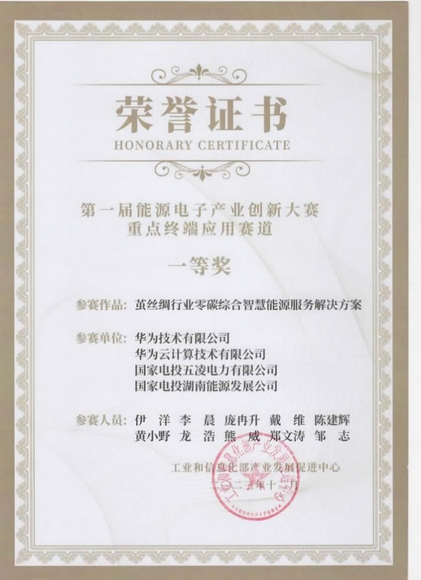 12月16日,由工業(yè)和信息化部產(chǎn)業(yè)發(fā)展促進(jìn)中心舉辦的第一屆能源電子產(chǎn)業(yè)創(chuàng)新大賽新型儲(chǔ)能產(chǎn)品及重點(diǎn)終端應(yīng)用賽道頒獎(jiǎng)儀式在江蘇溧陽(yáng)舉行。作為全球領(lǐng)先的ICT(信息與通信)基礎(chǔ)設(shè)施和智能終端提供商,華為技術(shù)有限公司作為牽頭單位申報(bào)的《繭絲綢行業(yè)零碳綜合智慧能源服務(wù)解決方案》(以下簡(jiǎn)稱“方案”)致力于整體降低繭絲綢企業(yè)用能成本,提供綠色繭絲綢國(guó)方案,最終獲得專家評(píng)委的充分肯定并斬獲一等獎(jiǎng)。