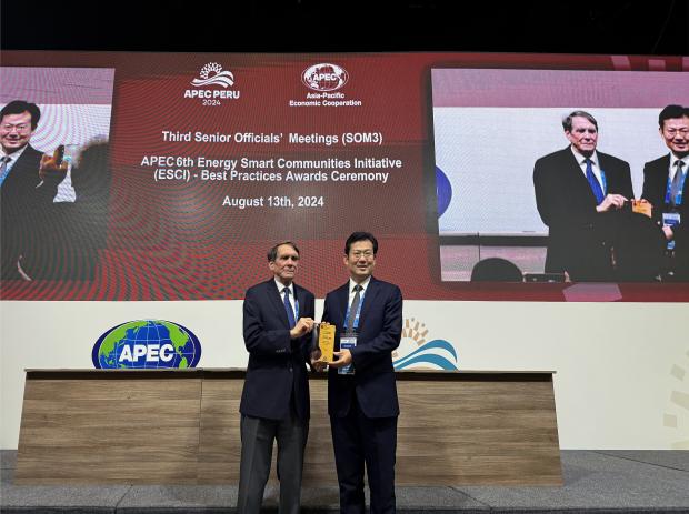 中國(guó)能源新聞網(wǎng)訊(黃峰 趙子煥)北京時(shí)間8月14日上午7時(shí)(當(dāng)?shù)貢r(shí)間8月13日18時(shí)),在秘魯利馬舉辦的第六屆APEC ESCI最佳實(shí)踐獎(jiǎng)?lì)C獎(jiǎng)典禮上,國(guó)家電投集團(tuán)浙江電力有限公司(以下簡(jiǎn)稱“浙江公司”)湖州綜合智慧能源項(xiàng)目獲評(píng)第六屆亞太經(jīng)合組織(APEC)能源智慧社區(qū)倡議(ESCI)最佳實(shí)踐獎(jiǎng) 低碳城鎮(zhèn)類別(LCMT)銀獎(jiǎng)。這也是中國(guó)首次在該平臺(tái)獲得的低碳城鎮(zhèn)類別獎(jiǎng)項(xiàng)。浙江公司黨委書(shū)記、董事長(zhǎng)李強(qiáng)上臺(tái)領(lǐng)獎(jiǎng),國(guó)家電投國(guó)際業(yè)務(wù)部副總監(jiān)成曉虹作專題發(fā)言。
