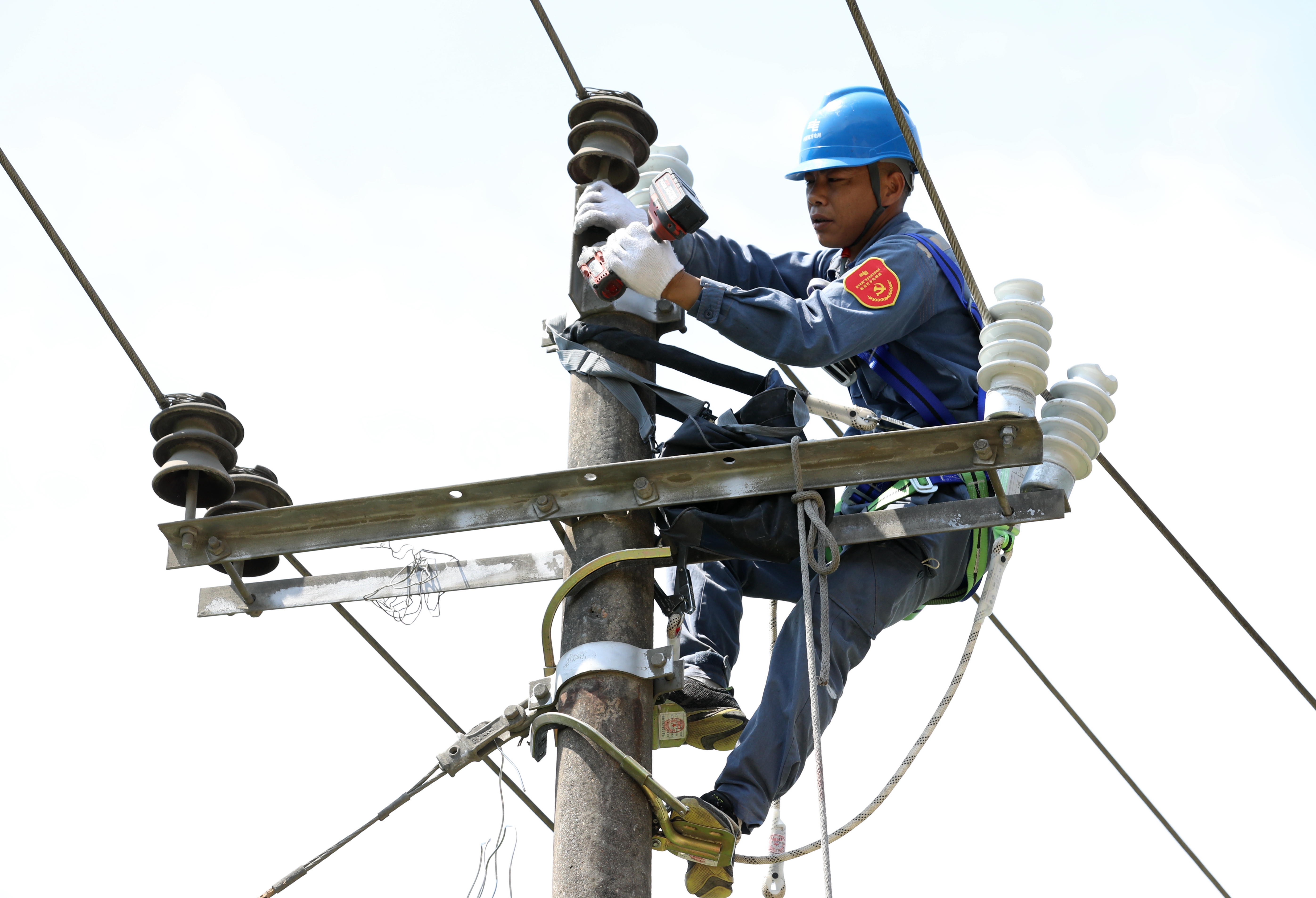 在田東縣游昌村10千伏大板線登檢工作現(xiàn)場,剛剛完成10號桿6個柱式瓷瓶更換工作的韋晗,一口氣喝掉一瓶水后,又匆匆趕往下一個工作地點。