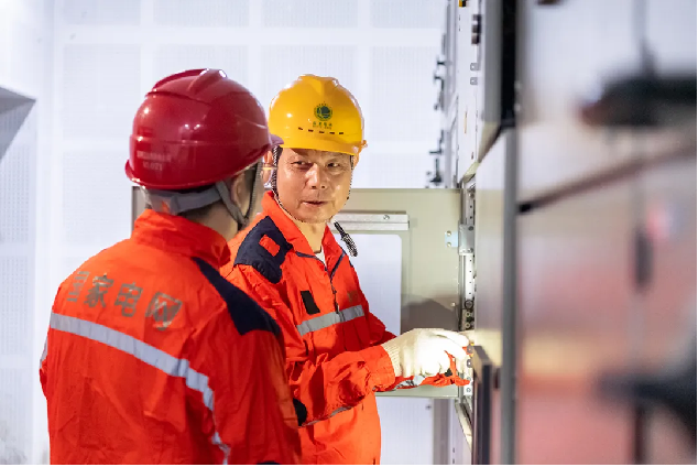 繞過兩排配電柜,映入眼簾的是兩排整齊的安全圍欄。圍欄中央的“在此工作”標(biāo)識(shí)牌后,一個(gè)人正頭戴安全帽,扎著馬步,弓身抬頭,一手拿著工具,另一只手在配電柜內(nèi)忙碌著。被汗水浸濕的工作服緊貼在身上,顯露出他結(jié)實(shí)的肌肉線條。