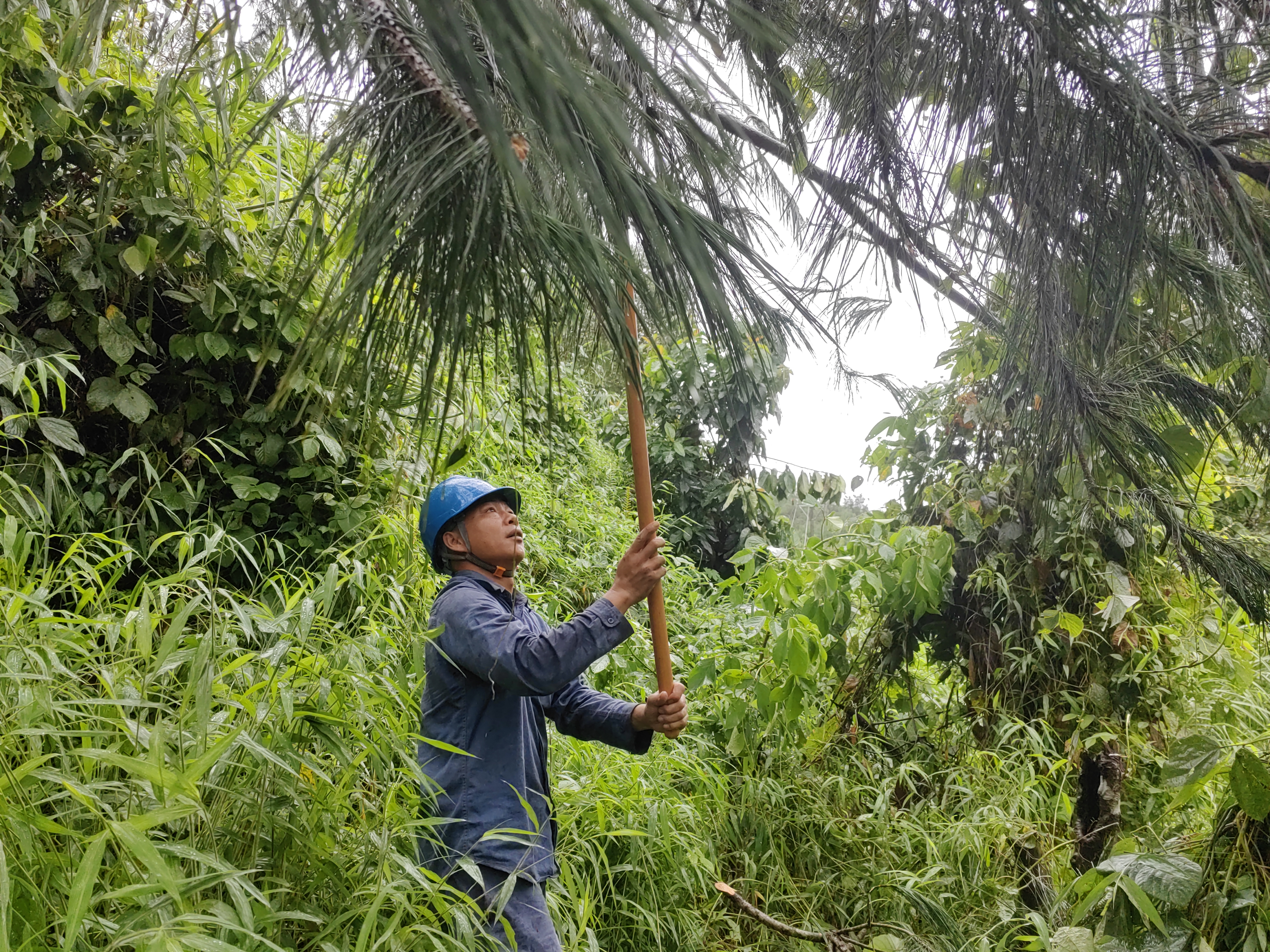 韋晗清理10千伏坤果線主線62~63號(hào)桿的樹障。蒙岳 攝