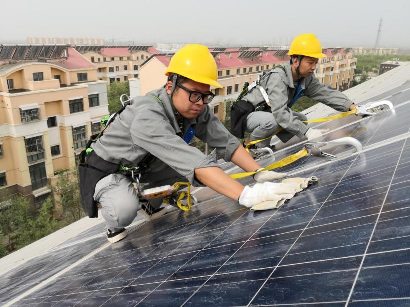 現(xiàn)場工作人員正在檢修屋頂光伏板