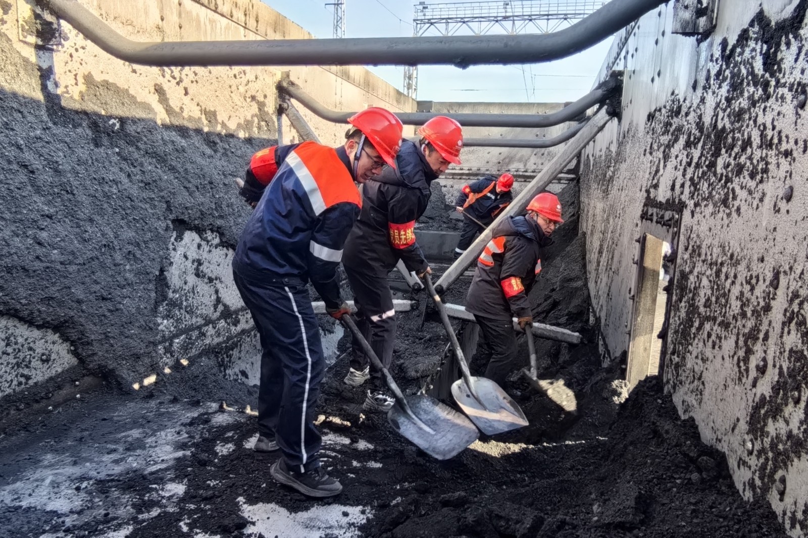 他們四五人一組,抄起大鎬、鐵鍬和大錘,對凍煤展開“攻擊”,一錘錘敲碎、一鏟鏟清除,金屬的碰撞聲與煤塊落下的聲音交織在一起,響徹清車場。
