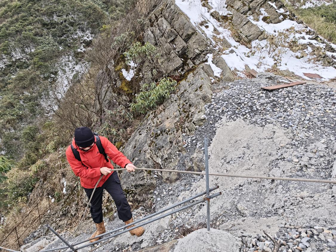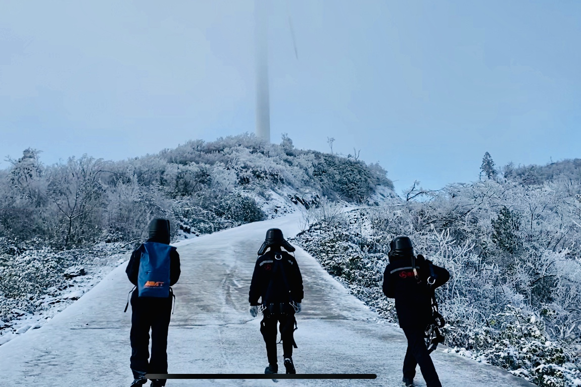 重慶新能源開發(fā)公司回山坪風(fēng)電場,地處七曜山山脈“脊梁”,風(fēng)電場所處之地地勢險峻、海拔高聳,每到冬季更是天寒地凍。積雪覆蓋著蜿蜒曲折的山路,那條通往風(fēng)場值班室的“大道”,因結(jié)冰嚴重人車均無法通行。早在1月26日,王萬祥等一行春節(jié)值守人員便毅然踏上了上山的攀爬之路。這條上山的小徑十分險峻,四周被大雪覆蓋,雜草肆意叢生,荊棘密密麻麻遍布期間。他們僅靠著一根登山棍、一雙冰爪,在這艱難的小路上艱難前行,在狹窄陡峭的石壁上奮力攀爬。