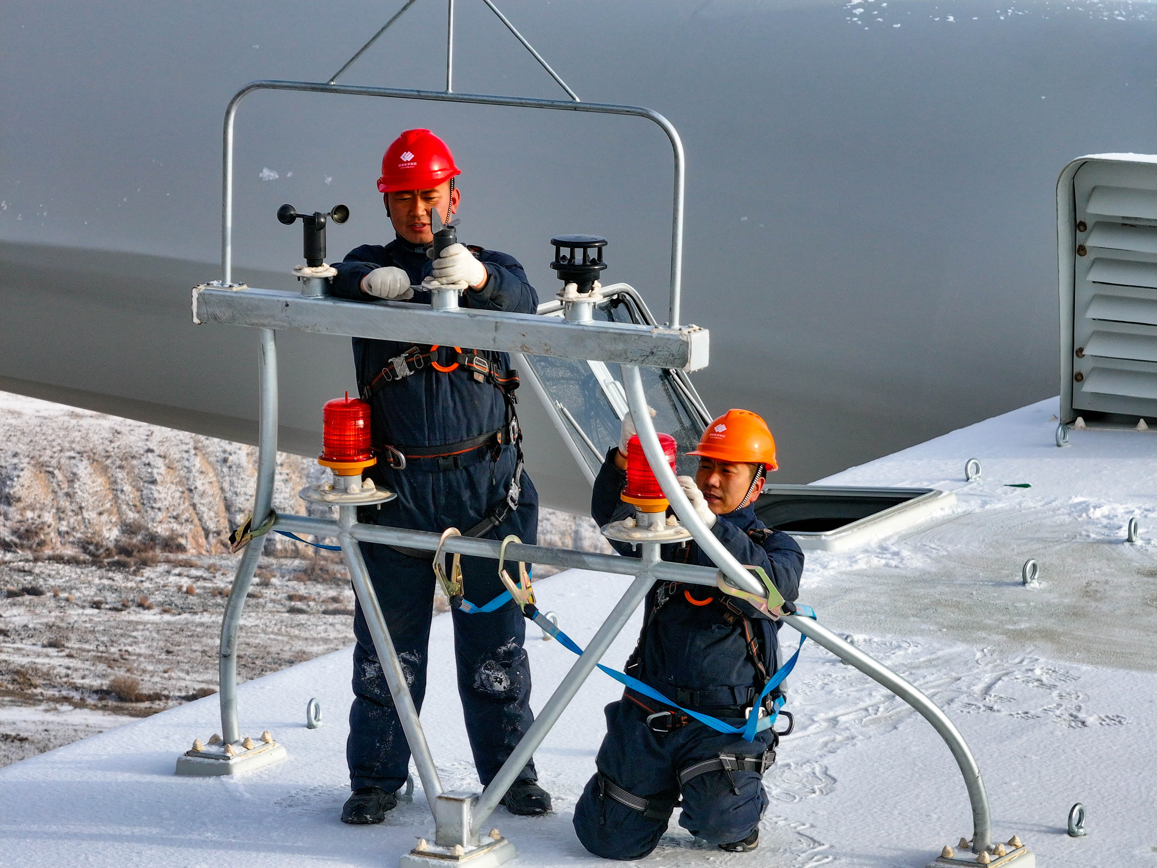 現(xiàn)場工作人員檢查風(fēng)電機(jī)組氣象監(jiān)測設(shè)備。