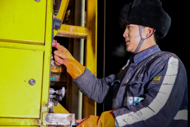筆者舉起相機(jī),取景框里的畫面令人動容:曹少飛在操作臺上俯身探查,目光緊鎖設(shè)備參數(shù);孫春利在下方快速打著手勢,協(xié)調(diào)現(xiàn)場動作;劉浩源半跪在鉆具旁,緊盯著鉆桿的回轉(zhuǎn)與振動,隨時(shí)準(zhǔn)備匯報(bào)異常。三人配合默契,在寒夜與設(shè)備故障展開較量。