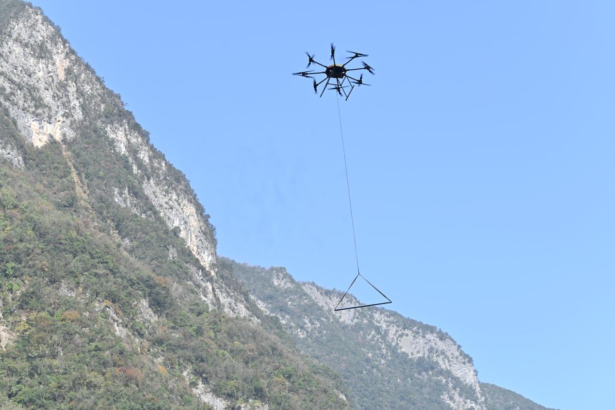 11月29日,在群山環(huán)繞、地勢險峻的重慶巫溪縣中梁鄉(xiāng)35千伏西土I回線改造現(xiàn)場,一架重載無人機將重約289公斤的塔材精準(zhǔn)送到17號塔位。該重載無人機每架單次最大載重量300公斤3。游紹斌攝