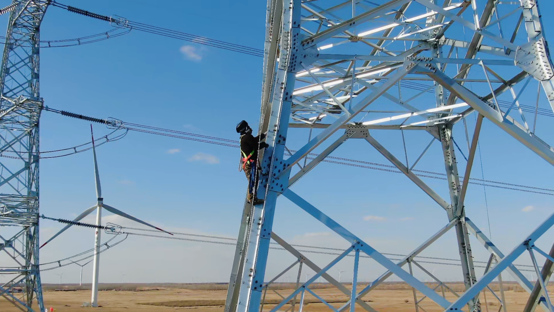 國網(wǎng)呼倫貝爾供電公司工作人員在蒙東扎蘭屯100萬千瓦風(fēng)儲項目送出工程新建500千伏布嶺線進(jìn)行桿塔螺栓緊固工作。高恩東 攝