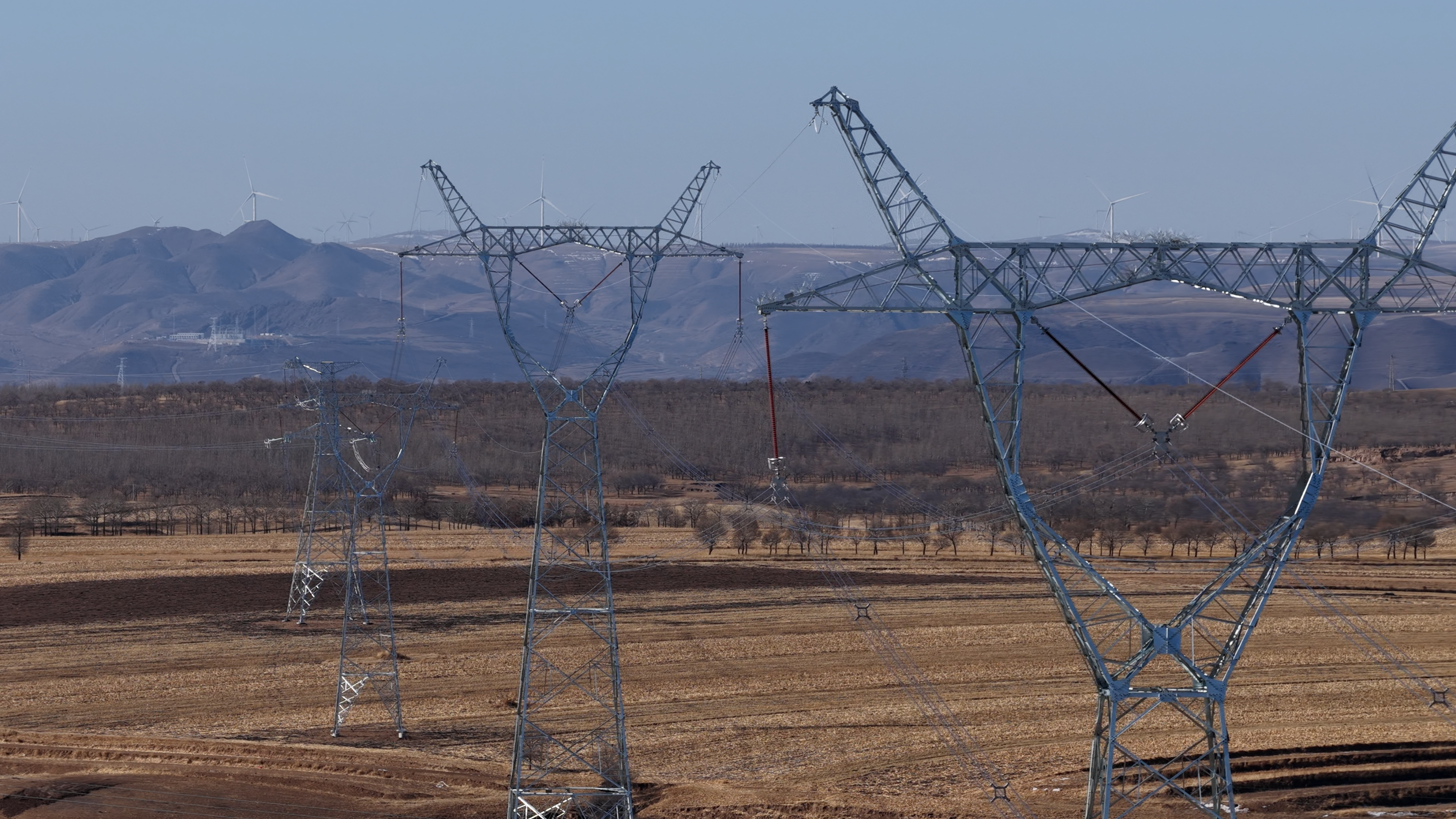 蒙東赤峰市翁牛特旗生態(tài)治理100萬千瓦風(fēng)電項目送出工程500千伏峰紫線。曹旭 攝