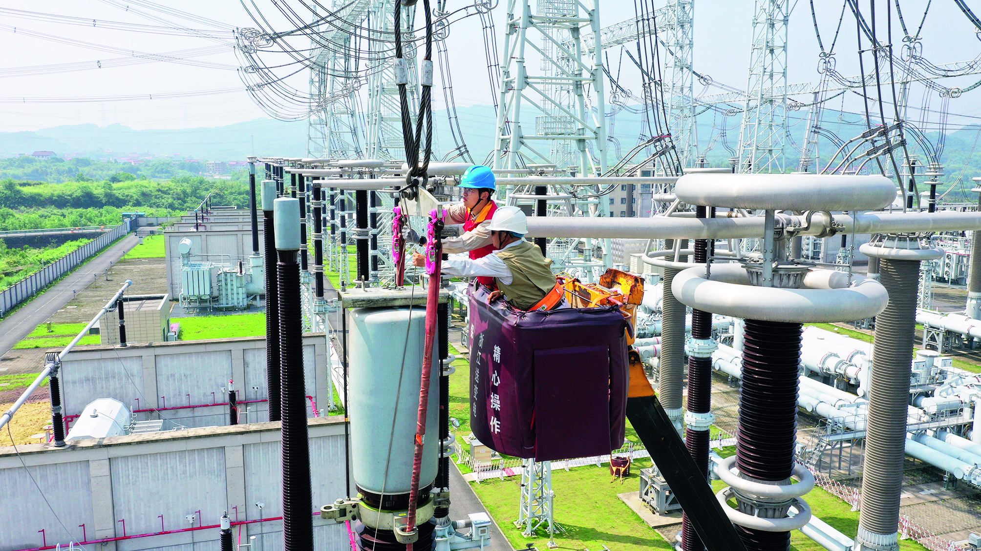 浙江電力檢修公司員工開展1000千伏特高壓蘭江站GOE套管拉桿隱患消除工作。王夢(mèng)芝 攝