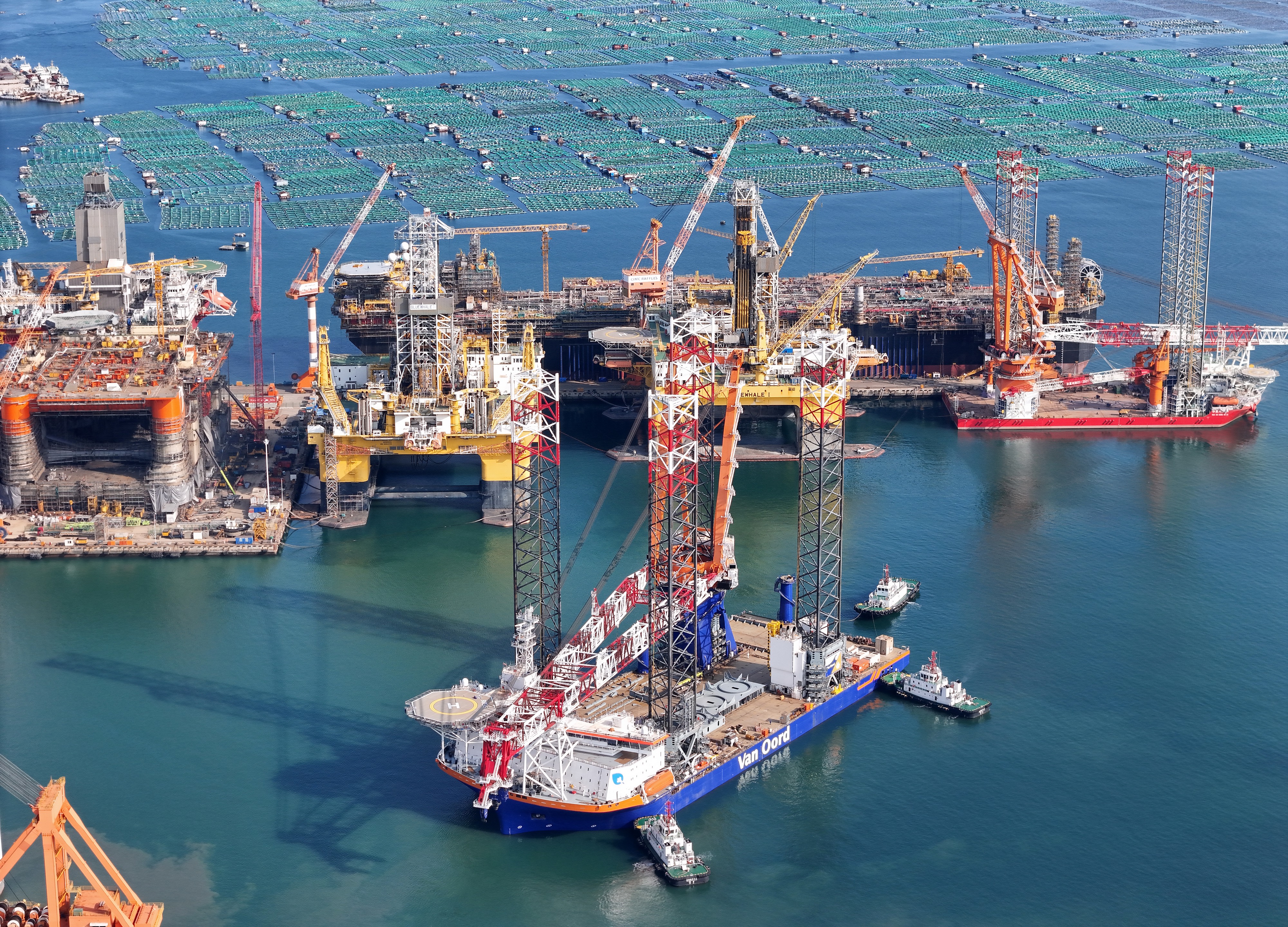 2024年10月16日,中集來福士山東煙臺(tái)建造基地,多型海工裝備和特種船舶在進(jìn)行建造和測試(無人機(jī)照片)。新華社發(fā)(唐克攝)