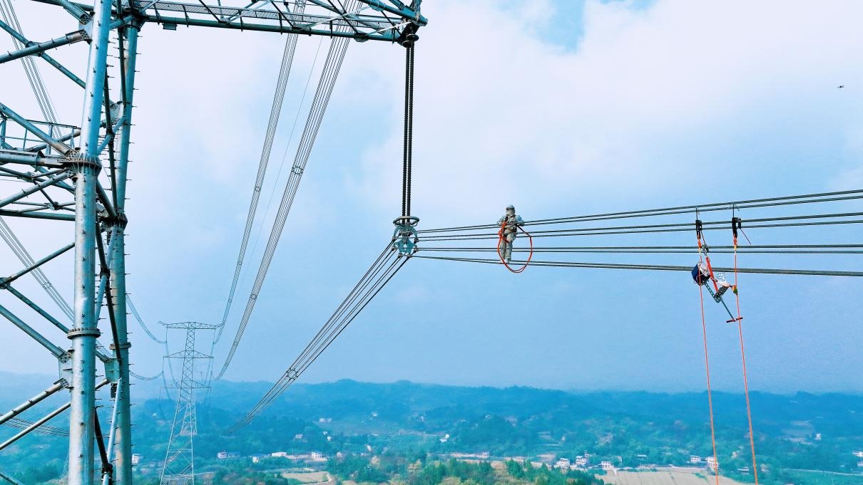 國網(wǎng)重慶超高壓公司帶電作業(yè)人員在1000千伏天岳Ⅱ線387號塔帶電處理導(dǎo)線掛點(diǎn)缺陷。(余昕垚攝)