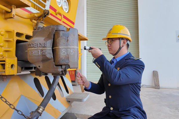 車庫(kù)內(nèi),叮叮的敲擊聲清脆響起。楊贍喻和工友開(kāi)始對(duì)一臺(tái)作業(yè)車進(jìn)行出庫(kù)前檢查。他半身探入車底,錘子輕敲,聲音伴隨著他的低語(yǔ):“走行部良好……螺栓無(wú)松動(dòng)……”隨后是電氣試驗(yàn)、制動(dòng)測(cè)試,每一個(gè)環(huán)節(jié)都仔細(xì)檢查,絲毫不敢懈怠?!按哼\(yùn)是咱們鐵路人的‘大考’,一顆螺絲掉了都不行?!睆能嚨壮鰜?lái)時(shí),他的雙手已蹭上許多黑油。