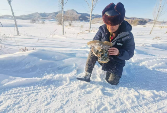 ▲國網(wǎng)伊春供電公司支援亞冬會保電人員胡金雷巡視66千伏輸電線路后,清理灌進(jìn)鞋中的雪。(張松濤攝)