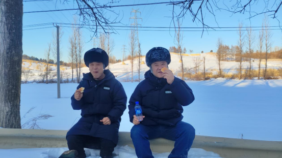 ▲國網(wǎng)伊春供電公司支援亞冬會保電人員王勤波、宋輝在巡線間隙吃午飯。(張松濤攝)