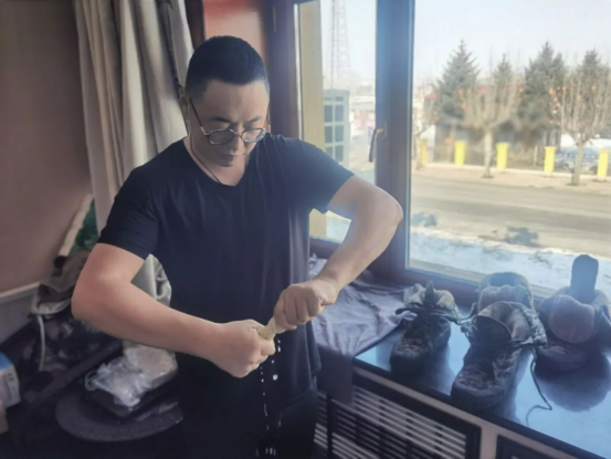 太陽下山,結(jié)束了這平凡的一天。隊(duì)員們回到駐地,第一件事就是脫下棉鞋和棉褲。由于巡線長時(shí)間深陷雪中,棉褲棉鞋早已被冰雪和汗水浸透,經(jīng)驗(yàn)豐富的他們早有準(zhǔn)備,每人都帶了三套衣物鞋襪,以便每天更換?!斑@棉鞋一兩天晾不干,我們就得準(zhǔn)備三雙鞋倒著穿,一到我們這兒啊,就看見哪哪曬的都是衣服和鞋?!苯寡笠贿呎f著一邊又把棉鞋支在窗前。